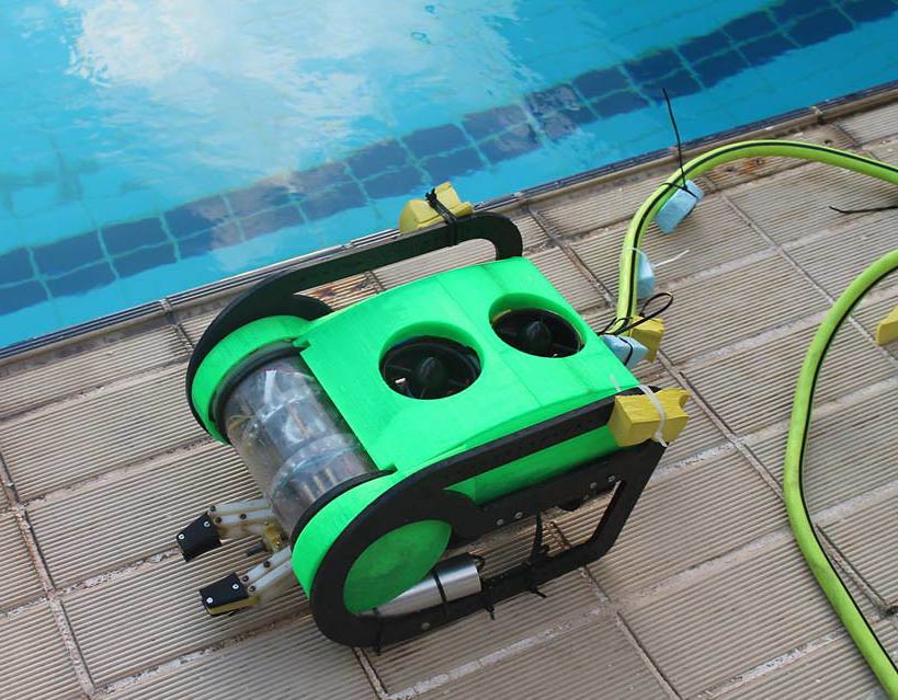 An ROV with bilge-pump thrusters and a 4" Watertight Enclosure.