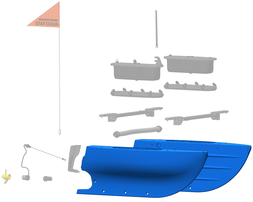 The hulls are durable rotomolded polyethylene like a typical kayak hull. Each hull has threaded inserts to attach the crossbars and brackets and a cutout to install the hatch base. Holes at the bottom are used to mount the motor with the M200 Motor mount and to attach payloads. The back of the hull can be covered by the available hull fairings to cleanly route the motor cables.